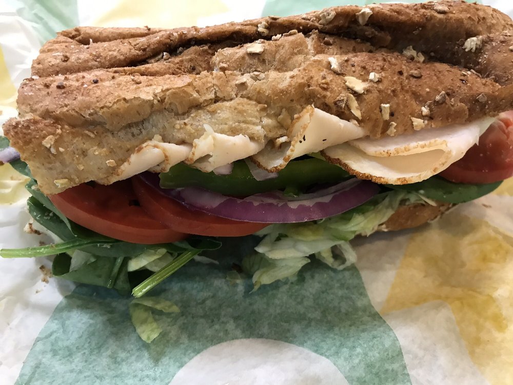 Oven-roasted turkey, Black Forest ham, USDA Choice Roast Beef, 2x American cheese piled on Hearty Multigrain bread and topped with lettuce, tomatoes, red onions, and mayo. A club sandwich Subway style.